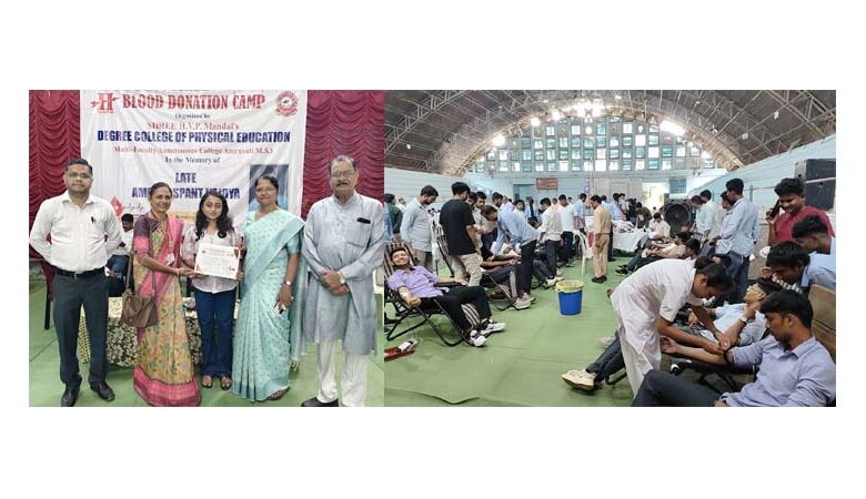 अमरावती/दि.11 – जन-जन को मैदानी खेलकूद और शारीरिक शिक्षा से अभिभूत करने वाले श्री हनुमान व्यायाम प्रसारक मंडल के आद्य संस्थापक स्व. अंबादासपंत वैद्य के 44 वे पुण्यस्मरण उपलक्ष में 9 सितंबर को मंडल के अनंत क्रीड़ा मंदिर सभागार में आयोजित भव्य रक्तदान शिविर में 151 रक्तदाताओं ने रक्तदान करके श्रद्धांजलि अर्पित की. संस्था के प्रधान सचिव पद्मश्री प्रभाकरराव वैद्य की प्रमुख उपस्थिति और मार्गदर्शन में आयोजित इस रक्तदान शिविर में संस्था के सभी पदाधिकारियों, सभी विभागों के प्रमुखों, प्राध्यापकों, विद्यार्थियों और शहर के युवाओं ने रक्तदान कर रक्तदान आंदोलन को मजबूत किया. इस अवसर पर पद्मश्री वैद्य साहब द्वारा रक्तदाताओं को प्रमाण पत्र वितरित किए गए.