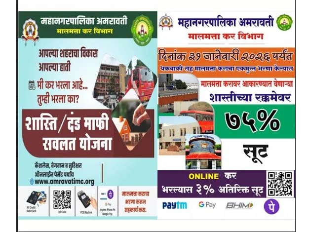 अमरावती/दि.23- अमरावती महानगरपालिका ने करदाताओं को बड़ी राहत देते हुए मालमत्ता कर पर लगने वाली शास्ती (दंड) में 75 प्रतिशत तक की माफी देने की घोषणा की है. यह सुविधा उन करदाताओं को मिलेगी, जो बकाया सहित मालमत्ता कर का एकमुश्त भुगतान करेंगे. यह जानकारी महानगरपालिका आयुक्त सौम्या शर्मा चांडक ने दी.