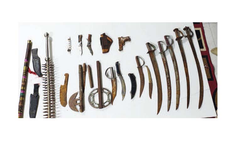 अमरावती /दि.24 – नांदगांव पुलिस ने शहर के दत्तवाडी इलाके में एक घर पर छापा मारकर हथियारों का बडा जखीरा बरामद किया है. पुलिस द्बारा की गई इस कार्रवाई में 5 तलवारे, 3 चायनीज चाकू, 1 पिस्तौल और अन्य 6 धारदार चाकू समेत कुल 10 से अधिक घातक हथियार जब्त किए है. यह कार्रवाई आरोपी दिपेश के घर पर छापा मारकर की गई.