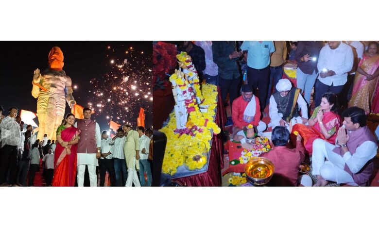 अमरावती/दि.20 – दीपावली के पावन पर्व पर हनुमान चालीसा चारिटेबल ट्रस्ट की ओर से समीपस्थ भानखेडा में हनुमान गढी परिसर स्थित राज्य के सबसे उंचे 151 फीट उंची संकटमोचन हनुमान की प्रतिमा के समक्ष बीती शाम भव्य-दिव्य दीपोत्सव का आयोजन किया गया. इस समय उपस्थितों ने हजारों दीप जलाकर परिसर को प्रकाशित कर दिया. इस अवसर पर भाजपा नेत्री व पूर्व सांसद नवनीत राणा तथा बडनेरा निर्वाचन क्षेत्र के विधायक रवि राणा सहित विभिन्न संत-महंतों एवं गणमान्यों की उपस्थिति में सर्वप्रथम 7 फीट उंचे दिये में अखंड ज्योत प्रज्वलित करते हुए महाबलि हनुमान की आरती की गई. इसके उपरांत रात 8 बजे दीपोत्सव की शुरूआत हुई. इस समय शहर सहित जिले के विभिन्न इलाको से आए भाविक नागरिकों ने 7 फीट उंचे अखंड दीप में अपने साथ लाए तेल की बूंदे अर्पित करने के साथ ही अयोध्या में भगवान श्रीराम के लंका विजय पश्चात हुए आगमन की खुशी में एक-एक दिया भी प्रज्वलित किया. जिसके चलते पूरा परिसर हजारों दियों के प्रकाश से आलोकित हो गया था. इसके उपरांत रात 9 बजे हनुमान गढी परिसर में शानदार आतिशबाजी भी की गई. जिसके चलते इस परिसर में बेहद विलोभनीय दृष्य दिखाई दिया.