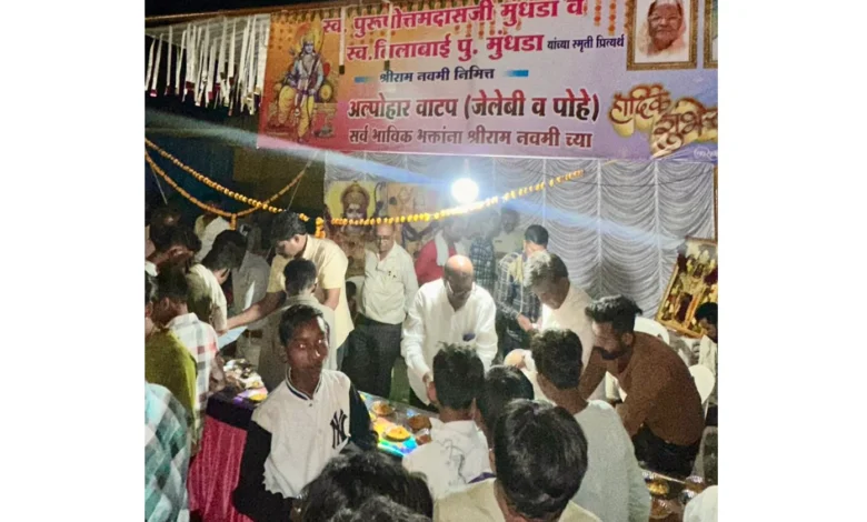 अमरावती/दि.30– रामनवमी के पाव अवसर पर स्व. लीलाबाई पुरूषोत्तमदास मुधडा की स्मृति में शहर के जूना मोटर स्टैंड स्थित मुख्य चौराहे पर भव्य नाश्ता वितरण कार्यक्रम आयोजित किया गया. इस अवसर पर श्रध्दालुओं व आम नागरिकों को करीब 2 क्विंटल पोहा एवं जलेबी का निशुल्क वितरण किया गया, जिसमें बडी संख्या में लोगों ने लाभ उठाया. यह सेवा कार्य आर.पी. मुधडा एवं मनीष मुंधडा द्बारा पिछले कई वर्षों से निरंतर किया जा रहा हैं. मुुंधडा परिवार का ययह सेवाभाव शहर में एक मिसाल बन चुका हैं.