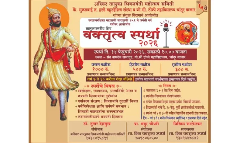 चांदूर बाजार/दि.9 – अखिल तहसील शिव जयंती महोत्सव समिति, स्व. सुमनबाई हर्डे बहुद्देशीय संस्था व गो.सी. टोम्पे महाविद्यालय के संयुक्त तत्वावधान में हिंदवी स्वराज्य के संस्थापक छत्रपति शिवाजी महाराज की जयंती व 356 वें शिवजयंती समारोह की पार्श्वभूमि पर तहसील स्तरीय शिव वकृत्व स्पर्धा का आयोजन 14 फरवरी को सुबह 10 बजे संत नामदेव सभागृह गो.सी. टोम्पे महाविद्यालय में किया गया हैं.