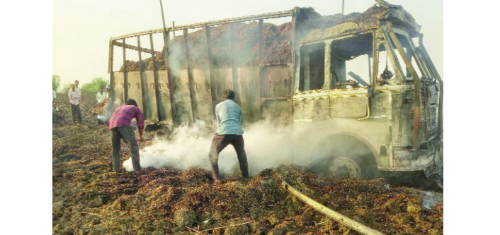 जानकारी के मुताबिक आसेगांव थाना क्षेत्र में आने वाले वाकी रायपुर से पूर्णा नगर मार्ग पर दौड रहे ट्रक में अचानक आग लग गई. इस ट्रक में कुटार भरा हुआ था. देखते ही देखते आग ने भीषण रुप धारण कर लिया. चालक सैफीन खां आवेश खां को जैसे ही ट्रक में आग लगने का पता चला तो उसने ट्रक को सडक से नीचे उतारकर खेत में जाकर उसे खडा कर दिया. घटना की जानकारी मिलते ही आसेगांव के थानेदार संजय राठोड अपने दल के पास तत्काल घटनास्थल आ पहुंचे. पश्चात अचलपुर और अमरावती का अग्निशमन दल घटनास्थल आ पहुंचा. नागरिकों की सहायता से इस आग को काबू में कर लिया गया. लेकिन तब तक ट्रक में भरा कुटार और ट्रक जलकर राख हो गया था. भाग्यवश इस घटना में कोई जीवित हानि नहीं हुई. लेकिन ट्रक संचालक का लाखों रुपयों का नुकसान हो गया.