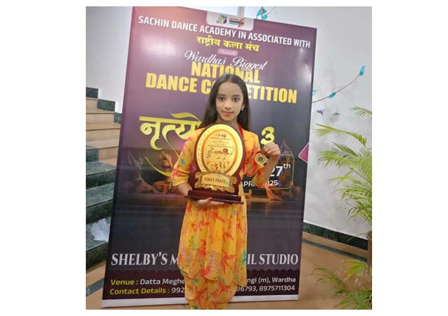 अमरावती / दि. 29– डॉ. अमित और डॉ. रूपाली भस्मे की सुपुत्री आरूही ने स्पर्धा की सचिन डाँस अकादमी और राष्ट्रीय कला मंच द्बारा आयोजित स्पर्धा में कथक सोलो में पहला स्थान प्राप्त किया. उसका व्याापक अभिनंदन हो रहा है. यह राष्ट्रीय स्तर की प्रतियोगिता थी. जिसमें अनेक राज्यों के स्पर्धक सहभागी हुए थे. ऐसे में नन्हीं आरूही ने ऐसा कत्थक नृत्य प्रस्तुत किया कि दर्शक मुग्ध हो गये. जमकर तालियां बजाई गई.