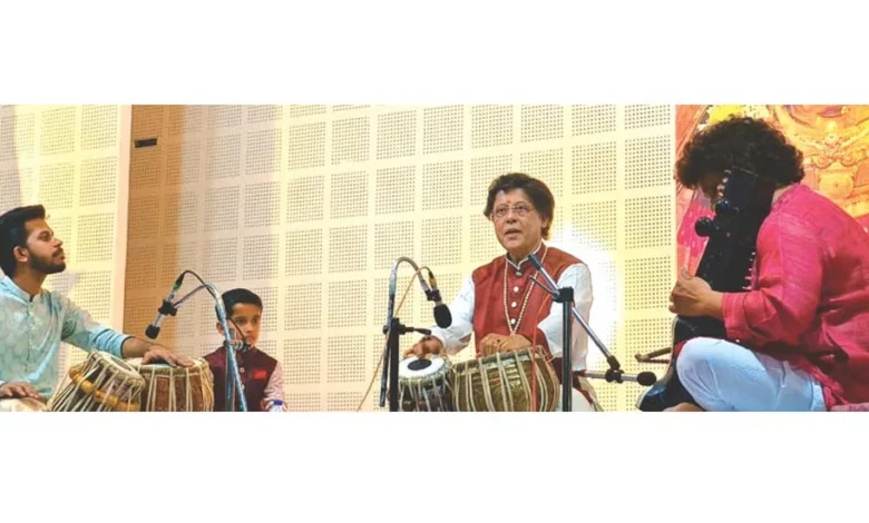अमरावती – तीन दिवसीय श्री अंबादेवी संगीत सेवा समारोह का रविवार रात कीर्तन सभागार में समापन हुआ. उस समय प्रस्तुति देते कोलकाता से पधारे विख्यात तबला वादक पंडित अनिंदो चैटर्जी और पं. अनुव्रता चैटर्जी.