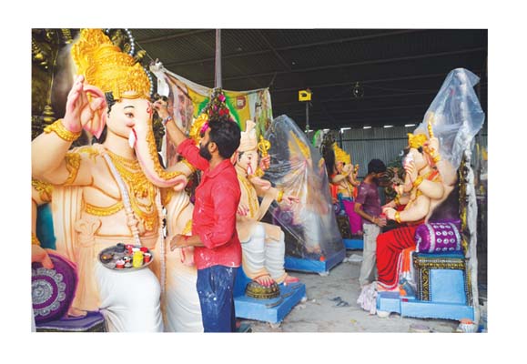 अमरावती/दि.19-निंभोरा के नारायण भगवान गोरेले तथा उनके सहयोगी गणेश जी की बडी मूर्तियों का कलर करते हुए. गणेशोत्सव आगामी 27 अगस्त से प्रारंभ हो रहा है. जिसके लिए जिले के सभी प्रमुख मूर्तिकारों ने फाइनल टच का कार्य प्रारंभ कर दिया है.