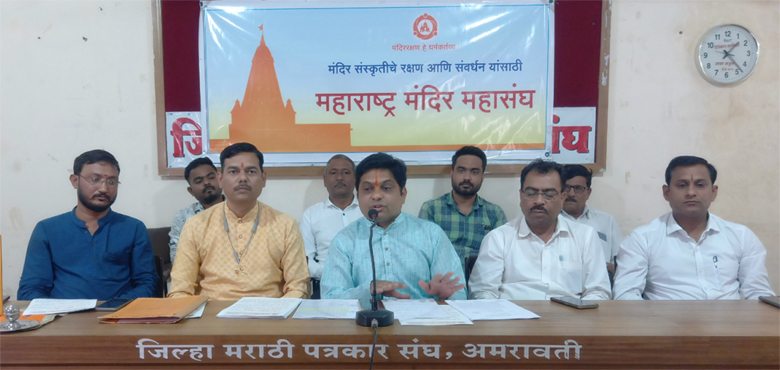 अमरावती/ दि. 26- ‘मंदिर रक्षणे हे धर्म कर्तव्य ’ घोष के साथ कार्यरत महाराष्ट्र मंदिर महासंघ में भाजी बाजार के श्री सोमेश्वर देवस्थान पश्चात अब रेवसा के श्री विठ्ठल रूख्माई संस्थान की 30 करोड की कीमती खेती बचाने का दावा किया. आज दोपहर मराठी पत्रकार भवन में आयोजित पत्रकार परिषद में महासंघ पदाधिकारियों ने इसे ऐतिहासिक विजय निरूपित करते हुए कहा कि आयएएस अधिकारी के कडक निर्णय से भ्रष्टाचार का पर्दाफाश हुआ. एसडीओ और तहसीलदार को जमीन का सातबारा अब पुन: श्री विठ्ठल रूख्माई संस्थान के नाम करना होगा. उन्होंने बताया कि यह लगभग 10 एकड जमीन रेवसा के प्रसिध्द गजानन धाम के पास स्थित है. पत्रकार परिषद में राज्य पदाधिकारी अनूप जायसवाल, जिला संयोजक विनित पाखोडे, नीलेश टवलारे, अधिवक्ता अभिजीत बजाज, संस्थान के ट्रस्टी राजेंद्र वाकोडे, हरिभाउ वाकोडे और अन्य उपस्थित थे.