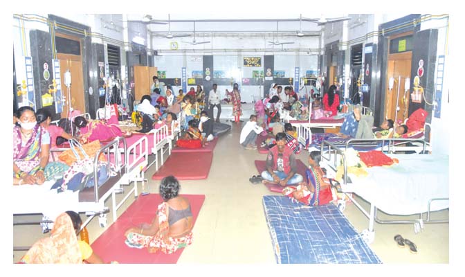 अमरावती/ दि. 17- लगातार बदल रहे मौसम के कारण वायरल इन्फेंक्शन के रोगी बढ रहे हैं. जिला सामान्य अस्पताल इर्विन में मरीजों की बढती संख्या के कारण जमीन पर गादी डालकर उनका उपचार किया जा रहा है. इसके पहले एक ही पलंग पर दो- दो मरीज को सुलाया गया था. अब जमीन पर सुलाकर उपचार की नौबत आयी है.