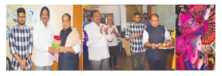 अमरावती/ दि. 6- पश्चिम विदर्भ क्षेत्र के अग्रणी हिंदी दैनिक अमरावती मंडल के खापर्डे बगीचा परिसर स्थित मुख्य कार्यालय में गणेशोत्सव पर्व निमित्त विघ्नहर्ता विनायक श्री गणेश की स्थापना करते हुए 10 दिवसीय गणेशोत्सव बडे ही हर्षोल्लास व श्रद्धाभाव के साथ मनाया जा रहा है. इस वर्ष दैनिक अमरावती मंडल कार्यालय में दगडू हलवाई गणपति की मूर्ति स्थापित की गई है. जिसका रोजाना सुबह-शाम पूरे विधिविधान के साथ आरती व पूजन किया जा रहा है और इसमें शहर के अनेकों गणमान्यों द्वारा हिस्सा लिया जा रहा है. जिसके तहत शनिवार प्रात:कालीन आरती हेतु पूर्व पालकमंत्री प्रवीण पोटे पाटिल अपने पुत्र श्रेयस पोटे पाटिल के संग पधारे. उनका दोनों अग्रवाल बंधुओं राजेश तथा अनिल अग्रवाल ने स्वागत किया. प्रवीण पोटे पाटिल और श्रेयस पोटे ने अग्रवाल बंधुओं और अपने सहयोगियों संग उत्साह के साथ गणपति की आरती की. पं. संजय पाण्डेय ने शास्त्रोक्त मंत्रोच्चार किया. विधि विधान से पूजन संपन्न करवाया. सनातन परंपरा के निर्वहन की प्रवीण पोटे पाटिल ने प्रशंसा की. उन्होंने अमरावती मंडल कार्यालय में सजाए गये पंडाल और आकर्षक लाइटिंग की बडी सराहना की. उन्होेंने इस तरह के उत्सव आयोजन को आवश्यक भी बताया.