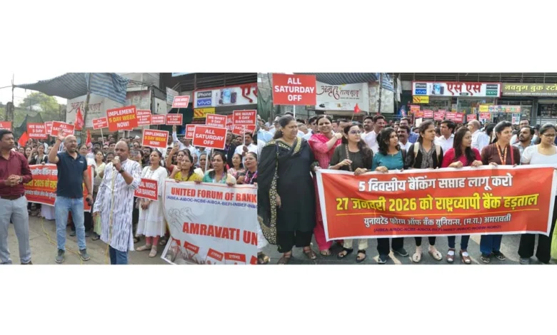 अमरावती – सप्ताह में दो दिन छुट्टी की मांग लेकर आज देशव्यापी हडताल कर रहे 9 बैंक संगठनों के अधिकारियों ने यहां राजकमल चौक पर एकत्र होकर अपनी डिमांड के पोस्टर लहराए और नारे भी लगाए. उसी अवसर के छायाचित्र लिए हैं.