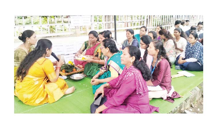 राष्ट्रीय स्वास्थ्य अभियान के कर्मचारियों को 15 फीसदी मानधन में वृध्दि व रॉयल्टी बोनस लागू करें, ग्रैच्युइटी मिले, इपीएफ लागू करें आदि सहित अनेक मांगों के लिए राष्ट्रीय स्वास्थ्य अभियान एकत्रीकरण समिति के स्वास्थ्य मंत्री प्रकाश आबिटकर को ज्ञापन द्बारा इन मांगों से अवगत कराया था. वर्ष 2016- 17 के पूर्व से कार्यरत कर्मचारी व अधिकारियों के वेतन में सुसूत्रता लाकर 25 प्रतिशत वेतन में वृध्दि करें आदि सहित अनेक मांगे आज तक मंजूर नहीं किए जाने तथा शासन द्बारा अनदेखी किए जाने से आंदोलन करना पड रहा है. ऐसा महानगरपालिका शहर लेखा व्यवस्थापन कल्पना दुधाल ने कहा. उन्होंने कहा कि इस संबंध में 8 जुलाई को स्वास्थ्य मंत्री से भेंट की गई. उन्होंने मांगों को तत्काल पूर्ण करने का आश्वासन दिया. साथ ही देवेन्द्र फडणवीस के साथ बैठक कर मामले को सुलझाने की बात कही. इस बीच 10 व 11 जुलाई को मुंबई के आजाद मैदान पर लक्षवेधी आंदोलन किया गया. इस समय शिष्टमंडल से भेंट स्वास्थ्य मंत्री आबिटकर ने 15 जुलाई को बैठक का आयोजन करने की बात कही. उस समय समिति ने 21 जुलाई से जारी बेमियादी हडताल को स्थगित किया. लेकिन शासन की ओर से मांगों पर कोई विचार नहीं करने से जारी बेमियादी हडताल के तहत शामिल महिला कर्मचारियों ने सर्वप्रथम आंदोलन पंडाल में हरतालिका की विधि विधान से पूजा अर्चना की. पश्चात सभी ने मंत्रोच्चारण के बीच सरकार को हमारी मांगे पूर्ण करने की सदबुध्दि प्रदान करें, ऐसी कामना करते हुए महिलाओं ने हरतालिका का व्रत रखा.