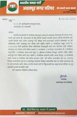 अचलपुर की नगराध्यक्ष रुपाली माथने द्वारा मंत्री बावनकुले के नाम जारी खुलासेवाला पत्र.
