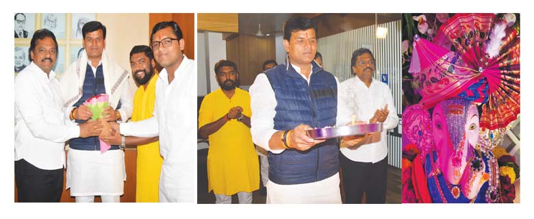 अमरावती/ दि. 6- पश्चिम विदर्भ क्षेत्र के अग्रणी हिंदी दैनिक अमरावती मंडल के खापर्डे बगीचा परिसर स्थित मुख्य कार्यालय में गणेशोत्सव पर्व निमित्त विघ्नहर्ता विनायक श्री गणेश की स्थापना करते हुए 10 दिवसीय गणेशोत्सव बडे ही हर्षोल्लास व श्रद्धाभाव के साथ मनाया जा रहा है. जिसके तहत इस वर्ष दैनिक अमरावती मंडल कार्यालय में दगडू हलवाई गणपति की मूर्ति स्थापित की गई है. जिसका रोजाना सुबह-शाम पूरे विधिविधान के साथ आरती व पूजन किया जा रहा है और इसमें शहर के अनेकों गणमान्यों द्वारा हिस्सा लिया जा रहा है. जिसके तहत शुक्रवार संध्या आरती हेतु विधायक रवि राणा पधारे. उनका दोनों अग्रवाल बंधुओं राजेश तथा अनिल अग्रवाल ने स्वागत किया. विधायक राणा ने अग्रवाल बंधुओं और अपने सहयोगियों संग उत्साह के साथ गणपति की आरती की. विधायक रवि राणा ने सुखकर्ता दुखहर्ता…. आरती गायी.