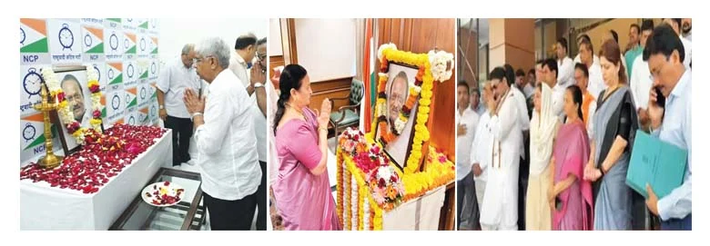मुंबई/दि.31 – राष्ट्रवादी विधायक दल की बैठक में सहभागी होने पहुंची सुनेत्रा अजीत पवार की विधान मंडल के द्वार पर अगवानी करती अमरावती की विधायक सुलभा संजय खोडके. दूसरे चित्र में विधान मंडल बैठक के समय अजीत दादा की प्रतिमा पर पुष्पांजलि अर्पित करते विधायक संजय खोडके और सुलभा खोडके.