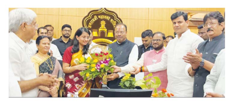 अमरावती/दि.27 – अमरावती मनपा क्षेत्र में चलाए गए स्वच्छता अभियान के तहत राष्ट्रीय स्तर पर ली गई स्वच्छ वायू सर्वेक्षण 2025 की स्पर्धा में अमरावती महानगर पालिका के प्रथम स्थान पर रहने के चलते हाल ही में मनपा आयुक्त सौम्या शर्मा का राजधानी नई दिल्ली में केंद्रीय ग्रामविकास मंत्री भूपेंद्र यादव का प्रशस्तीपत्र, सम्मानचिन्ह व 75 लाख रुपए का नकद पुरस्कार प्रदान कर सत्कार किया गया. इस उपलब्धि के चलते गत रोज मनपा मुख्यालय में पालकमंत्री चंद्रशेखर बावनकुले की अध्यक्षता के तहत हुई बैठक में बडनेरा निर्वाचन क्षेत्र के विधायक रवि राणा ने आयुक्त सौम्या शर्मा के अभिनंदन का प्रस्ताव रखा. जिसे सर्वसम्मति से स्वीकार किया गया. इसके चलते पालकमंत्री चंद्रशेखर बावनकुले के हाथों आयुक्त सौम्या शर्मा का शॉल-श्रीफल व पुष्पगुच्छ देकर सम्मान किया गया.