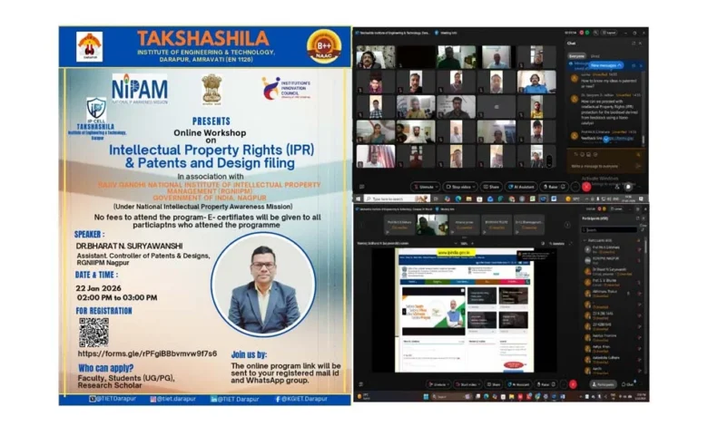 दारापुर / दि.9 – श्री दादासाहेब गवई चैरिटेबल ट्रस्ट अमरावती द्बारा संचालित स्थानीय तक्षशिला अभियांत्रिकी महाविद्यालय में राष्ट्रीय बौध्दिक संपदा जागरूकता अभियान अंतर्गत ‘बौध्दिक संपदा अधिकार और पेटंटस व डिजाइन फाइलींग’ इस विषय पर प्राचार्य डॉ. डी.टी. इंगोेले व समन्वयक प्रा. एस.व्ही. भूते के मार्गदर्शन में ऑनलाइन कार्यशाला का आयोजन तक्षशिला अभियांत्रिकी महाविद्यालय के बौध्दिक समता कक्ष द्बारा राजीव गांधी राष्ट्रीय बौध्दिक संपदा व्यवस्थापन संस्था नागपुर के सहयोग से किया गया था.
