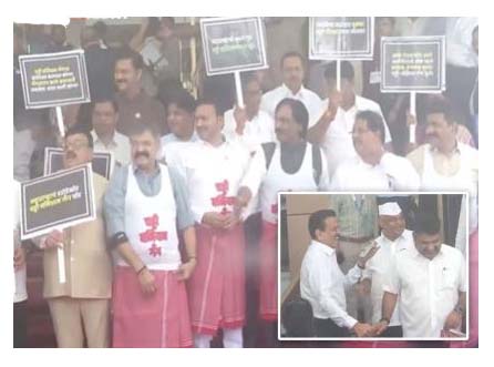 खास बात यह रही कि, जिस समय विपक्षी विधायकों द्वारा विधान भवन की सीढियों पर सरकार विरोधी नारेबाजी की जा रही थी, तभी वहां से डेप्युटी सीएम अजीत पवार तथा मंत्री गिरीश महाजन भी गुजरे, जो विपक्षी विधायकों द्वारा किए गए इस वेशांतर को देखकर अपनी हंसी को नहीं रोक पाए.