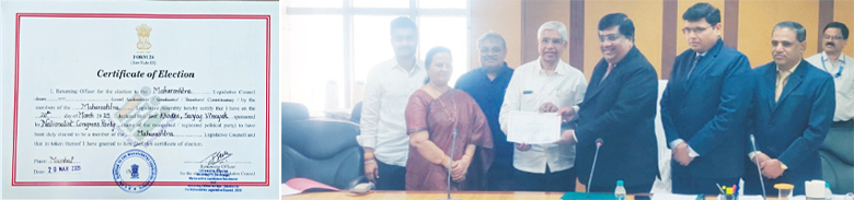 मुंबई /दि.20- राज्य विधान परिषद की 5 रिक्त सीटों के लिए होने वाले चुनाव की नामांकन प्रक्रिया के तहत आज नामांकन वापसी का अंतिम दिन था और चूंकि इस चुनाव के लिए 5 सीटों हेतु 5 ही नामांकन दायर हुए थे. ऐसे में पांचों प्रत्याशियों को निर्विरोध निर्वाचित घोषित किया गया. जिनमें अजीत पवार गुट वाली राष्ट्रवादी कांग्रेस पार्टी की ओर से प्रत्याशी बनाए गए संजय खोडके का भी समावेश रहा. जिन्हें निर्वाचन निर्णय अधिकारी द्वारा विधान परिषद की सदस्यता का प्रमाणपत्र जारी किया गया है. जिसके चलते अब संजय खोडके अधिकारिक तौर पर विधायक निर्वाचित हो गए है. साथ ही उनके रुप में अमरावती को राज्य विधान मंडल में एक ओर प्रतिनिधि प्राप्त हुआ है. जिसके चलते अमरावती से खोडके दंपति के कई समर्थकों व चाहनेवालों का मुंबई पहुंचने का सिलसिला शुरु हो गया है और सभी को मुंबई पहुंचकर वहां नवनिर्वाचित विधायक संजय खोडके तथा अमरावती की विधायक सुलभा खोडके सहित राकांपा के युवा नेता यश खोडके का अभिनंदन कर रहे है.