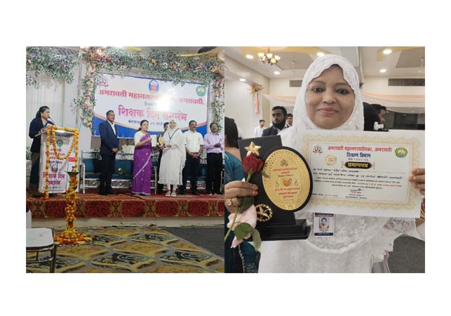 अमरावती /दि.25 – मनपा शिक्षण विभाग की ओर से भारतरत्न डॉ. एपीजे अब्दुल कलाम आदर्श शिक्षक अवार्ड से किया गया सम्मानित अमरावती, मनपा के शिक्षण विभाग की ओर से शैक्षणिक सत्र 2025 और 26 में उत्कृष्ट कार्य करने वाली अध्यापिका सीमा सहर शेख अफजल चौधरी, शाला क्रमांक 8 जमील कॉलोनी को आदर्श शिक्षक पुरस्कार सम्मान से नवाजा गया, उनके शैक्षणिक कार्य तथा विद्यार्थियों व समाज उन्नयन हेतु योगदान को देखते हुए उन्हें भारतरत्न डॉ. ए.पी.जे. अब्दुल कलाम आदर्श शिक्षक पुरस्कार से सम्मानित किया गया.