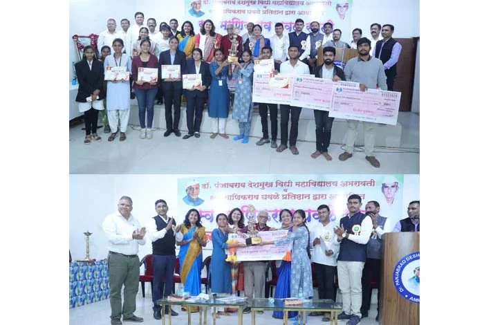 डॉ. पंजाबराव देशमुख विधी महाविद्यालय और स्व. माणिकराव घवले स्मृती प्रतिष्ठान के संयुक्त तत्वावधान में आयोजित 24 वी वाद विवाद स्पर्धा का पुरस्कार वितरण समारोह श्री. शिवाजी शिक्षण संस्था के कोषाध्यक्ष दिलीप बाबु इंगोले की अध्यक्षता में संपन्न हुआ.इस अवसर पर प्रमुख अतिथी के रूप में प्राचार्या डॉ. स्मिता देशमुख, प्राचार्य डॉ. वर्षा देशमुख, प्रा. डॉ. महेंन्द्र मेटे, परीक्षक डॉ. स्वप्निल इंगोले, प्रा. डॉ. एकनाथराव तट्टे, प्रा. मैझनी बायदनी उपस्थित थे. स्पर्धा में प्रथम पुरस्कार राधाबाई गोयंनका महाविद्यालय अकोला की वैष्णवी पागृत, अंकिता कागंदे की टिम को मान्यवरो के हस्ते फिरती ढाल, 11 हजार रूपये नगद और स्मृती चिन्ह प्रदान कर सम्मनित किया गया. वही स्पर्धा में प्रथम व्यक्तिगत पुरस्कार आरडीआय के महाविद्यालय बडनेरा के आदित्य टोले को 7 हजार रूपये नगद, स्मृती चिन्ह, ग्रंथ व प्रमाणपत्र मान्यवरो के हस्ते दिया गया.