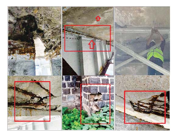 पूरे स्लैब में कांक्रीट की परत झड चुकी है. जिससे सरीयों अर्थात लोहे की रॉड को जंग काफी लग गया है. कई स्थानों पर दरारें चौडी हो गई है. हनी कॉम्बिंग और डीलैमीनेशन पायी गई है.