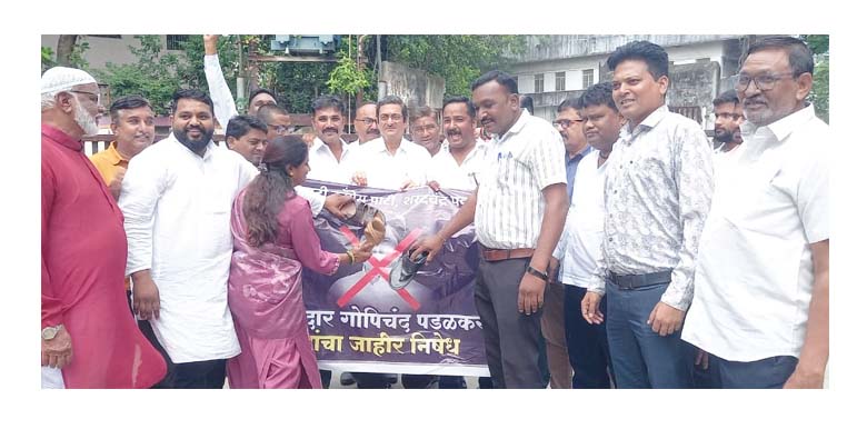 अमरावती/ दि. 23-राष्ट्रवादी कांग्रेस शरद पवार के नेताओं ने आज दोपहर बीजेपी विधायक गोपीचंद पडलकर की तस्वीर पर जोडे मारो आंदोलन कर निषेध व्यक्त किया. वालकट कंंपाउंड के पास राकांपा शहर जिलाध्यक्ष प्रा. हेमंत देशमुख के नेतृत्व में आंदोलन किया गया.