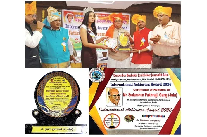 दर्पणकार बालशास्त्री जांभेकर जर्नलिस्ट एसोसिएशन द्बारा आयोजित इंटरनेशनल अचीवर्स अवार्ड-2026 में सुदर्शन पुखराज गांग (जैन) को समाजिक क्षेत्र में उनके उत्कृष्ट एवं प्रेरणादायी योगदान के लिए सम्मानित किया गया. यह पुरस्कार शिर्डी स्थित होटल शांतिकमल में आयोजित समारोह में प्रदान किया गया. इस अवसर पर अध्यक्ष डॉ महेंद्र देशपांडे, साई बाबा संस्थान के मुख्य कार्यकारी अधिकारी गौरक्ष गाडीलकर, पाटिल जिला माहिती अधिकारी आदि अनेक गणमान्य व्यक्तियों की उपस्थिति रही. श्री गांग को मिले इस सम्मान पर विभिन्न सामाजिक, शैक्षणिक एवं पत्रकारिता जगत से जुडे लोगों ने उन्हें बधाई दी और उनके कार्यों की सराहना की.