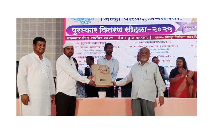 अमरावती /दि.10 – जिल्हा परिषद, अमरावती के शिक्षण विभाग की ओर से मंगलवार 9 सितंबर को जिला नियोजन भवन, अमरावती में पुरस्कार वितरण समारोह-2025 का आयोजन किया गया. इस अवसर पर जिल्हा परिषद उर्दू कन्या स्कूल, खोलापुर के शिक्षक सैयद इरशाद सैयद अशफ़ाक़ को स्पेल-बी जिला स्तरीय पुरस्कार से सम्मानित किया गया.