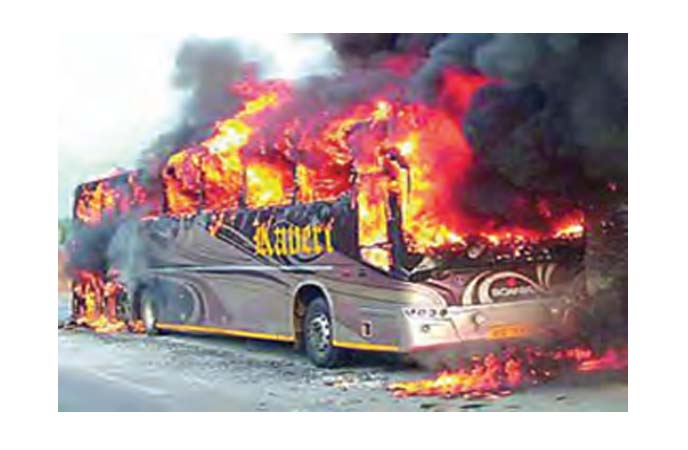 इस ‘द बर्निंग ट्रैवल्स’ में 15 यात्री सवार थे. सभी यात्री सकुशल है. अग्निशमन दल घटनास्थल पहुंचने तक बस पूरी तरह से जलकर राख हो गई थी. कर्नाटक से केए-29/एन-1166 क्रमांक की 17 सीटर ट्रैवल्स कुछ दिन पूर्व प्रयागराज, अयोध्या दर्शन के लिए रवाना हुई थी. सोमवार को दोपहर में वापस लौटते समय महागांव में ट्रैवल्स चालक ने इंधन की टंकी फुल की थी. महागांव से निकलते ही 15 किमी दूरी पर चिल्ली घाट के योगायोग धाबा के पास अचानक ट्रैवल्स का सामने का टायर फट गया. टायर का विस्फोर्ट होने से चालक ने सतर्कता बरतते हुए बस को सडक किनारे लाने का प्रयास किया. तब बस टकरा गई और सामने से धुआं निकलना शुरु हो गया. चालक ने यात्रियों को तत्काल उतरने की सूचना दी. चालक ने भी किसी तरह अपनी जान बचाई. लेकिन आग ने दो मिनट में ही भीषण रुप धारण कर लिया. यह घटना घटित हुई, तब इंधन की टंकी न फुटने से भारी अनर्थ टल गया. इस दौरान मार्ग से आवाजाही करने वालों में से शिंदे सेना के प्रवक्ता चितांगराव कदम ने तत्काल उमरखेड नगर परिषद के अग्निशमन दल को घटना की जानकारी दी. अग्निशमन दल को पहुंचने में कुछ समय लग गया. तब तक आग ने भीषण रुप धारण कर लिया. घटना की जानकारी मिलते ही उमरखेड पुलिस स्टेशन के उपनिरीक्षक भास्कर दरणे अपने दल के साथ घटनास्थल आ पहुंचे. पुलिस ने दूसरे वाहन की व्यवस्था कर सभी यात्रियों को उस वाहन में बिठाकर कर्नाटक राज्य की तरफ रवाना किया. उमरखेड पुलिस मामले की जांच कर रही है.
