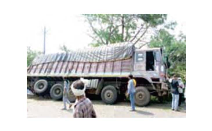 मालवाहक ट्रक बेरिकेट्स से टकराकर हुआ पलटी