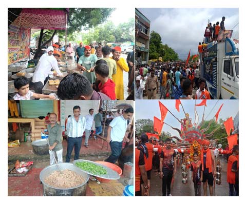 दर्यापुर व मुर्तिजापुर की सीमा पर स्थित पूर्णा नदी के तट पर पश्चिम विदर्भ के शिव भक्तों की काशी रहे तिर्थक्षेत्र लक्षेश्वर संस्थान लाखपुरी में श्रावण महीने के हर रविवार को शिवभक्त हजारों की संख्या में रात से ही कावड लेकर जाते है और सोमवार को अपने कंधो पर कावड लेकर पैदल दर्यापुर आते है. आज सोमवार 18 अगस्त को अंतिम श्रावण सोमवार रहने से महाकावड यात्रा लाखपुरी से निकलकर दर्यापुर पहुंचते ही हनुमान व्यायाम क्रीडा मंडल बनोसा द्बारा संचालित महाकाल कावड मंडल, नवयुवक शिवभक्त मंडल आनंद नगर व रोहिदास नगर निलकंठेश्वर, ओंकारेश्वर मंदिर कावड मंडल मलियेपुरा तथा दर्यापुर के विविध कावड मंडल व विविध राजनीतिक दल, सामाजिक संगठना, व्यापारी संगठना ने जोरदार स्वागत किया. पेट्रोल पंप चौक में अजय वसू मित्र मंडल की तरफ से केले और साबूदाना उसल का विरतण किया गया. साथ ही बनोसा में व्यापारी व गांधी नगर मित्र मंडल की तरफ से साबुदाना खिचडी, मट्ठा और केले का वितरण किया गया. इस अवसर पर शिवभक्तों के हर हर महादेव के जयघोष से दर्यापुर नगरी गूंज उठी थी और संपूर्ण वातावरण भक्तिमय हो गया था. इस महाकावड यात्रा के दौरान पुलिस का भी तगडा बंदोबस्त था. साबुदाना खिचडी वितरण के समय राजूभाउ कपीले, रमेश नेसकर, सुरेश सांगोले, किरण शाह, प्रदीप दानडे, खंडेलवाल, रेखा पाटिल व सैंकडों सहयोगी उपस्थित थे. थानेदार सुनिल वानखडे के नेतृत्व में तगडा बंदोबस्त तैनात था.