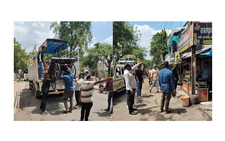 अमरावती /दि.16-मनपा आयुक्त के ‘ मिशन फुटपाथ फ्रीडम’ अंतर्गत मंगलवार 15 जुलाई को सुबह 11.30 बजे से झोन क्रमांक 3 अंतर्गत दस्तुर नगर क्षेत्र में अतिक्रमण हटाओ अभियान चलाया गया. राजेंद्र कॉलोनी से मोती नगर मार्ग पर की गई कार्रवाई में सडक सहित फुटपाथ पर दुविधा निर्माण करनेवाले हाथगाडी, फ ल विक्रेता, लोखंडी पानठेले तथा होटल के बाहर बढाकर रखे शेड पर मनपा के अतिक्रमण दल द्बारा कडी कार्रवाई की गई.