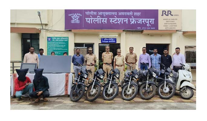 अमरावती/दि.30 – स्थानीय फ्रेजरपुरा पुलिस ने वाहन चोरी सहित चोरी के कुछ मामलो की सघन जांच-पडताल करते हुए दो कुख्यात चोरों को गिरफ्तार करने में सफलता हासिल की है. जिनके पास से अलग-अलग पुलिस थाना क्षेत्रों से चुराए गए 7 दुपहिया वाहनों सहित 2 एलईडी टीवी भी जब्त किए गए है. बरामद हुए माल की कीमत 3 लाख 90 हजार रुपए आंकी गई है. पकडे गए दोनों चोरों के नाम आकाश उर्फ कोबरा विनोद कंगाले (28, आदिवासी नगर) एवं रितीक उर्फ मेहरा अशोक चव्हाण (29, सिद्धू नगर) बताया गया है.