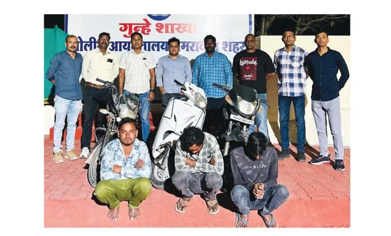 अमरावती /दि.11 – दुपहिया वाहन चुरानेवाले तीन बदमाशों को क्राइम ब्रांच के दल ने गिरफ्तार कर उनके पास से तीन दुपहिया जब्त कर ली है. गिरफ्तार आरोपियों के नाम रहमतपुरा निवासी साजीद उर्फ शाहरुख मन्सूर खान (30), मो. नईम मो. कलीम (25) और सादिया नगर निवासी शेख इरफान उर्फ भुर्या शेख मन्सूर (30) है.