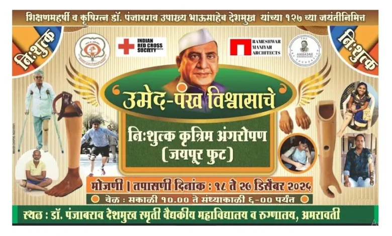 श्री शिवाजी शिक्षण संस्था द्बारा संचालित डॉ. पंजाबराव उर्फ भाउसाहेब देशमुख स्मृति वैद्यकिय महाविद्यालय अमरावती, इंडियन रेड क्रॉस सोसायटी शाखा अकोला, रामेश्वर मणियार आर्किटेक्ट व डॉ. अंबादास खोब्रागडे आर्ट फाउंडेशन द्बारा आयोजित इस उपक्रम का उद्घाटन समारोह स्थानीय डॉ. पंजाबराव देशमुख स्मृति वैद्यकिय महाविद्यालय में गुरूवार 18 दिसंबर को सुबह 11 बजे हो रहा है. इस कार्यक्रम में नागरिकों को उपस्थित रहने का आवाहन आयोजकों की ओर से किया गया हैं. इस उपक्रम के तहत 18 से 27 दिसंबर तक सुबह 10 से शाम 6 बजे तक दिव्यांगो की गिणती और जांच की जाएगी. पश्चात दिव्यांगों को निशुल्क कृत्रिम अंगरोपण (जयपुर फुट) प्रदान किए जाएंगे