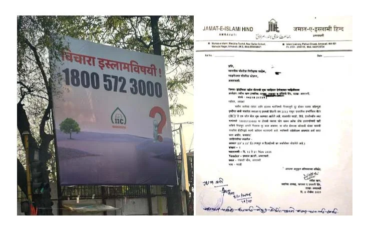 अमरावती/दि.14- स्थानीय गाडगे नगर पुलिस थाना क्षेत्र अंतर्गत पंचवटी चौराहे पर ‘आईआईसी महाराष्ट्र’ नामक एक गुमनाम से संगठन द्बारा लगाए गए होर्डिंग को लेकर विगत दो दिनों से अमरावती शहर में अच्छा खासा हंगामा मचा हुआ हैं और भाजपा सहित हिंदुत्ववादी संगठनों ने इसे धर्मांतरण का प्रयास बताते हुए होर्डिंग लगानेवाले संगठन व उससे संबंधित लोगों के खिलाफ कार्रवाई करने की मांग उठाई हैं. वहीं इस बीच जमाते इस्लामी हिंद की अमरावती शाखा के अध्यक्ष रफीक खान द्बारा गाडगे नगर पुलिस थाने को दिया गया एक पत्र सामने आया है. जिसमें रफीक खान ने पुलिस से पंचवटी चौराहे पर स्थित होर्डिंग पर उक्त पोस्टर लगाने की अनुमति मांगी थी. परंतु गाडगे नगर पुलिस ने अनुमति देने की बजाय इस हेतु अमरावती मनपा से अनुमति लेने का अभीप्राय लिखकर दिया था. लेकिन अब तक यह स्पष्ट नहीं हो पाया है कि रफीक खान द्बारा मनपा से अनुमिती ली गई थी या नही जिसके चलते उस पोस्टर की अनुमति व वैधता को लेकर संभ्रम बना हुआ है.