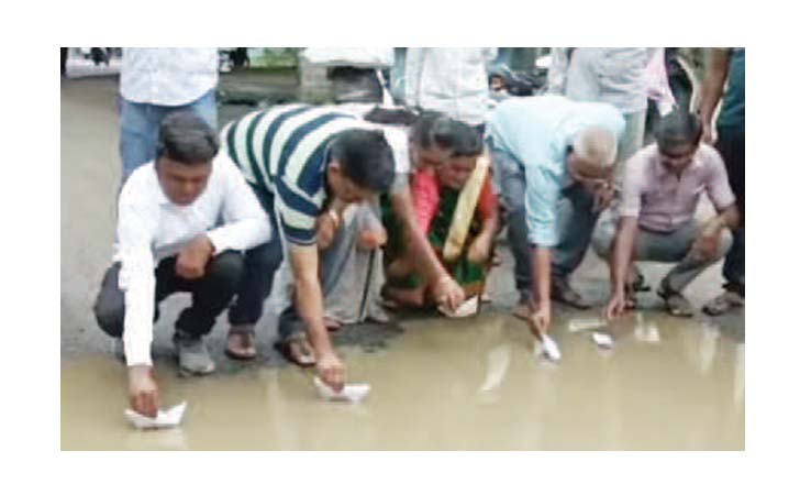 वंचित बहुजन आघाडी ने रास्ते के गढ्ढों में छोडी कागज की नांव